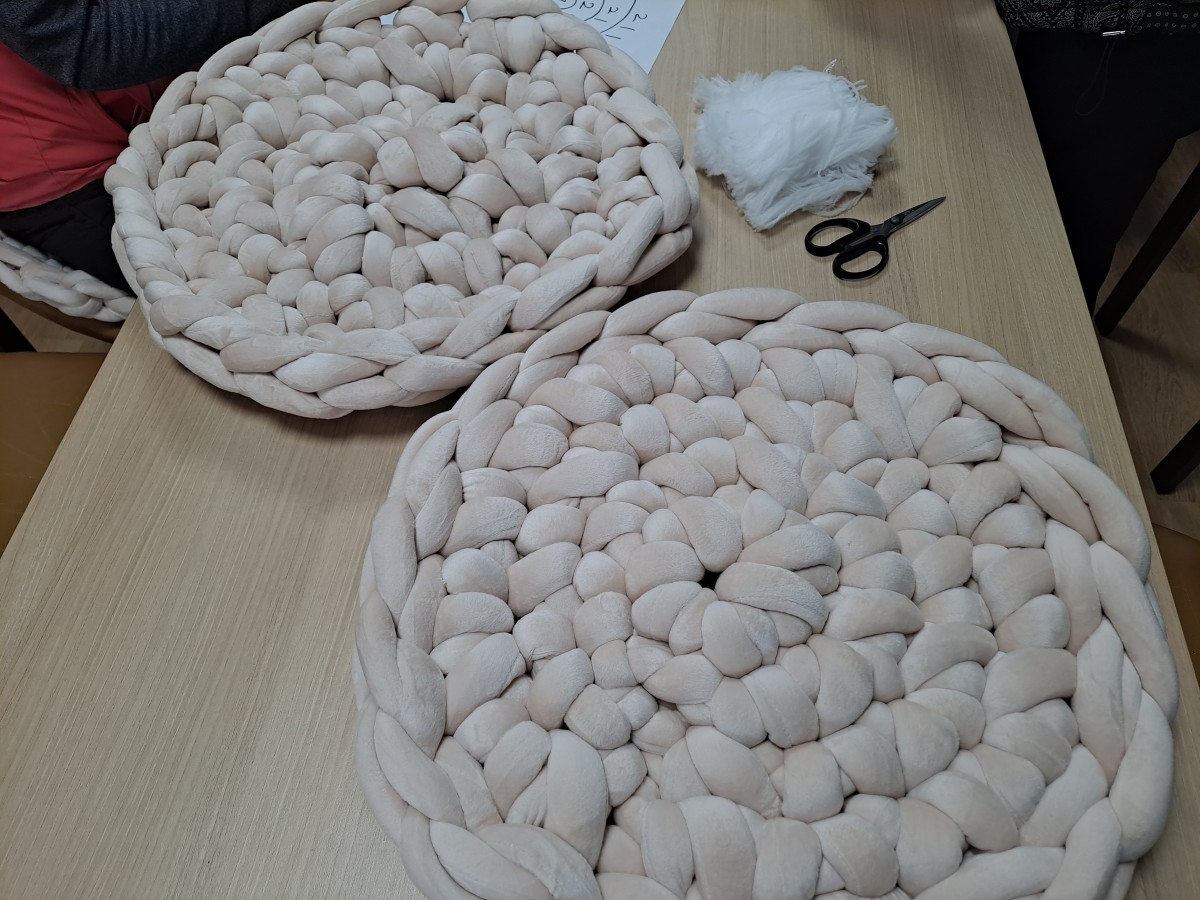 생전 처음 해보는 자이언트얀 방석뜨기라 처음에는 어려워 했는데 강사님께서 한분 한분 옆에서 봐주시면서 하다 보니 울퉁불퉁 모양은 제각각 이지만 다들 방석을 완성하셨습니다.