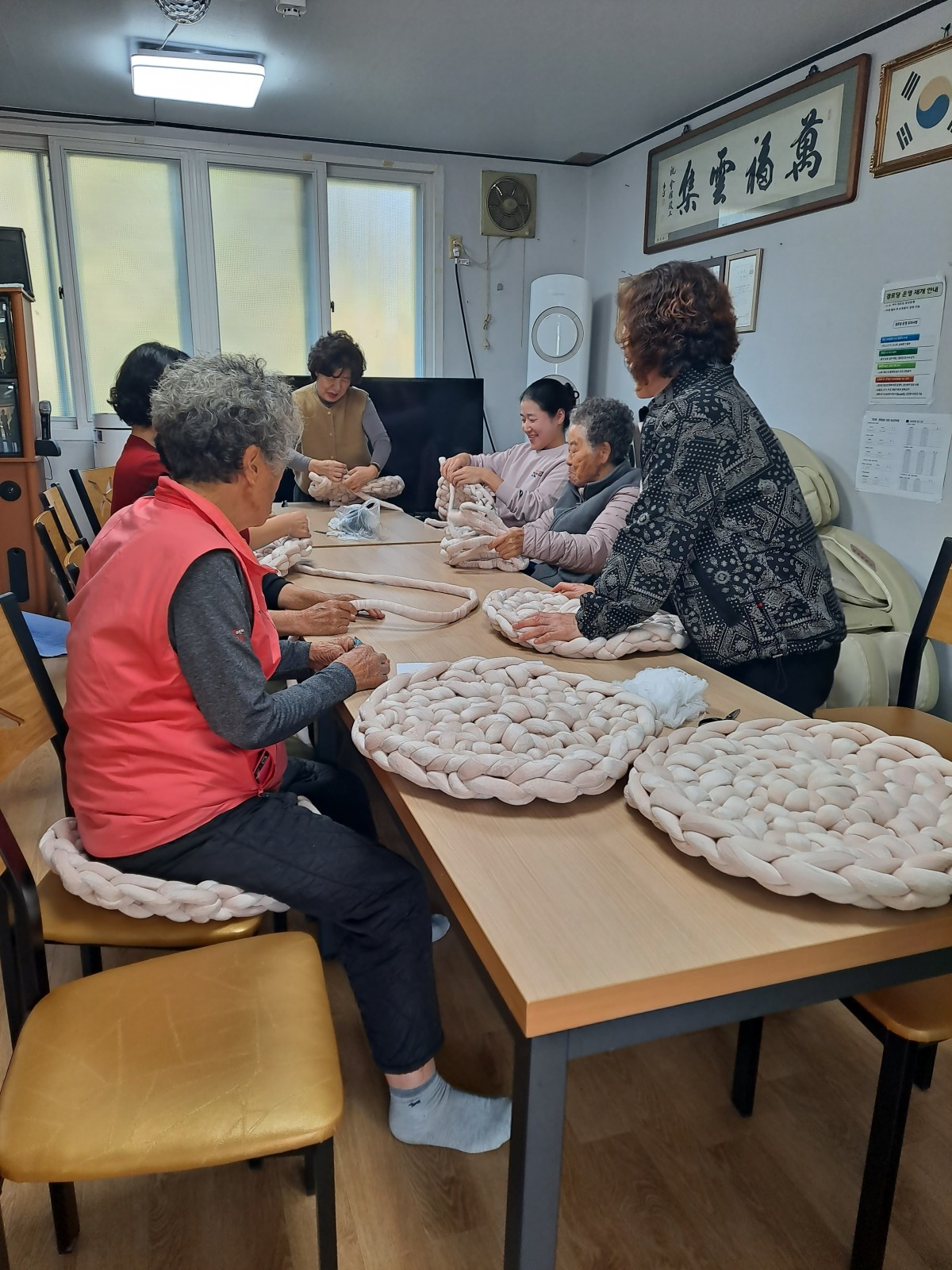 우로실마을 경로당에서 얼마 전에는 수세미 뜨개질 교육이 있었고 어제는 자이언트얀 방석뜨개를 하였습니다.