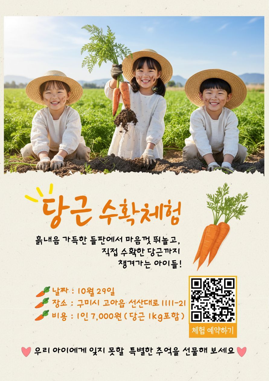 가을 들판에서의 당근 수확 체험-금오산찰쌀보리마을 페이지 정보 작성자 보리 작성일25-10-21 10:27 조회30회 관련링크 본문 10월 29일 당근 수확 체험 합니다~ 목록 이전글'25 경북 문화마을 이야기 박람회 25.10.22 다음글2025 김천김밥축제 개최 25.10.16